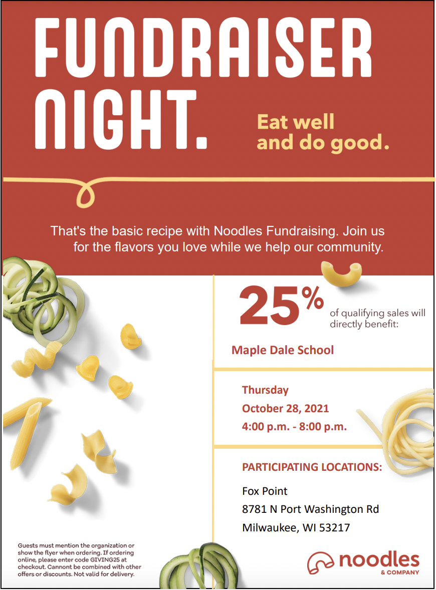 Order Noodles online or in-person and 25% of the sale will be donated to Maple Dale's 8th grade trip to Washington, D.C. If you order online, make sure you type GIVING 25 in the coupon area and press apply. If you order in person, you must show the flyer to the cashier in order for our group to receive credit.